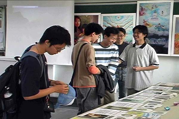 有缘人都是纷纷主动进入了解。绝大部分的人对法轮大法表现出支持和理解,在看完精美的图片报导后,很多都表示想学功。来参观的除了青年学生,还有许多是学生的家长。社团学生的家长高妈妈表示:“很高兴学校有这个社团,希望孩子多炼功多学法。”一个毕业的校友带着女朋友回来仔细的参观了展览,并且询问如何修炼。一位家长看到展览非常高兴,说一直都在寻找法轮功,没想到在这里找到了。她详细的向学员问了许多问题之后,当场向学员借《转法轮》回家看。