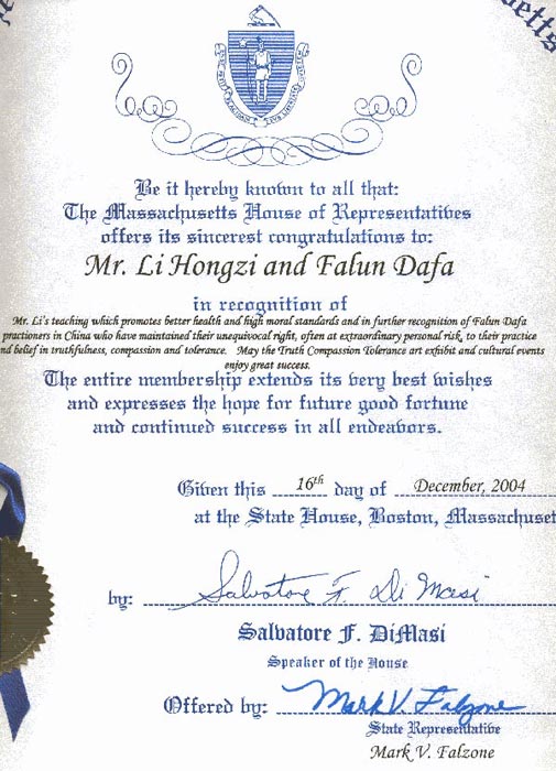 麻省(即马萨诸塞州)众议院2004年12月16日发布公告褒奖李洪志先生和法轮大法。