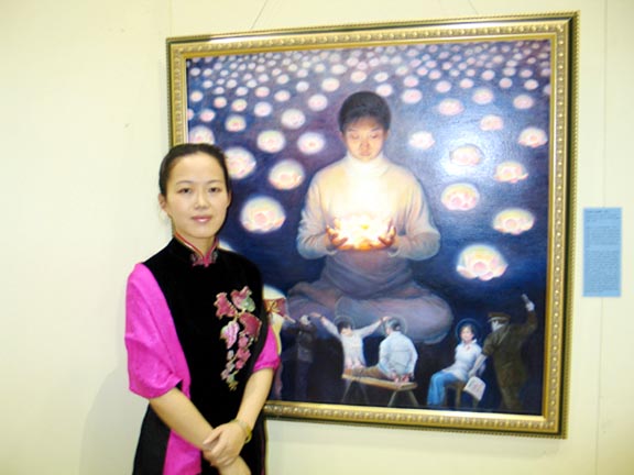 陈肖平女士有五、六幅作品参与展出。《莲心》的创意,缘自2003年她与几千位来自世界各地的法轮功学员在美国华盛顿林肯纪念碑下烛光夜悼时的感动,当时她在夜色中手捧莲灯,泪流不止。想到受迫害而死的同修,不免悲从中来,但她在作品中表现的更多的不是悲伤,而是亮色与希望:如果世界上的每个人都能知道了真象,都能在心中手中点一盏莲灯,那迫害马上就会停止。