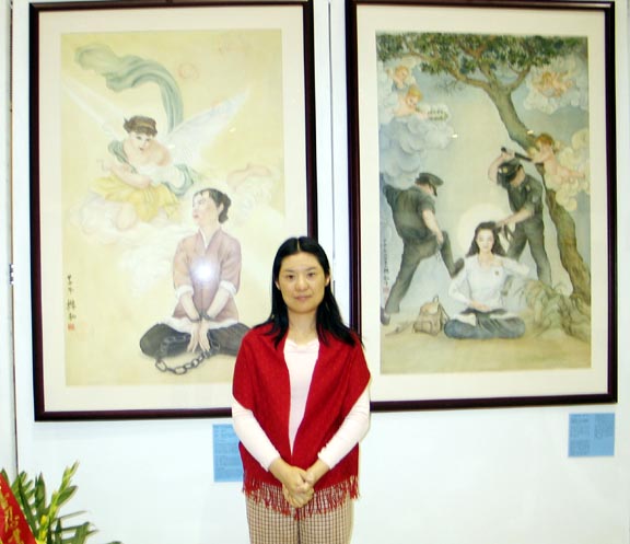 樊弘女士的两幅画是在丝娟上创作的,结合了传统的中国工笔画与西洋的亮色彩,反复着色数十次方成。每幅画都历时数月完成,而且落笔着色不能有任何错失,否则就得全部重新来过。画里表现的基本是她本人在中国身受的迫害,其间鲜见怨恨与哀伤,反之,慈悲劝善与因果报应之意跃然之上。