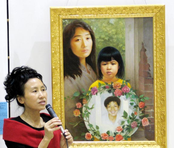 ![]() 艺术家汪卫星女士和她的展出作品《我要爸爸》 |