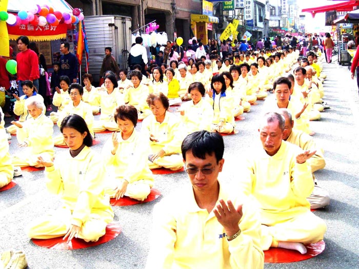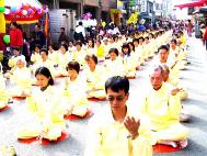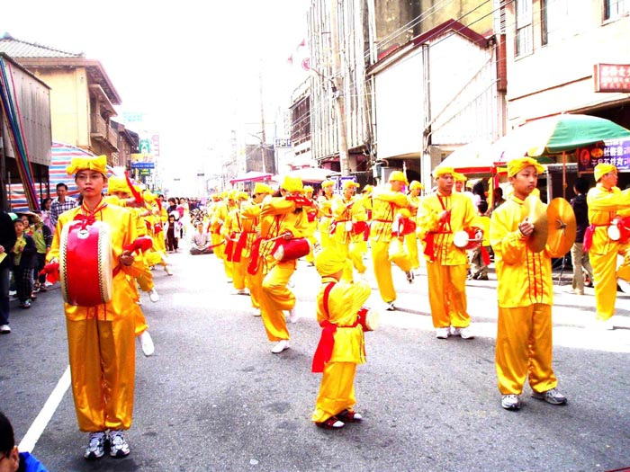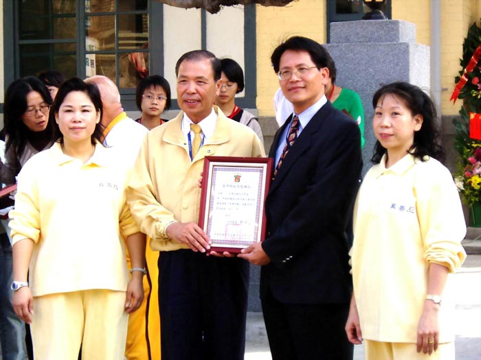 ![]() 台中县长黄仲生(左二)颁发感谢状 | ![]() 法轮功第五套功法演示 | ![]() 法轮功腰鼓队表演 |