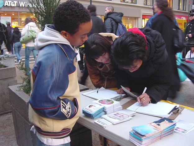 现在接资料的人越来越多,特别是白人接的很多,有些白人看展板,站在那里长时间听学员讲真象。早上我们在世贸中心打出的横幅:“很多你们的中国同事被蒙骗,并帮助传播中国共产党的谎言,不要被他们的话误导,你自己去看法轮功的真实故事。”几乎所有的白人路过时都看,接资料的人也很多。