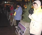有两个西人,来到学员演示酷刑的前面,听了学员向他们讲真象后,流着眼泪,要站在演示酷刑的学员旁边照相作为纪念。还有两个路人,看见酷刑演示,一个就开始严厉的指着演示警察的学员说,你怎么能把她们折磨成这个样子,另一个就要动手打那个学员。