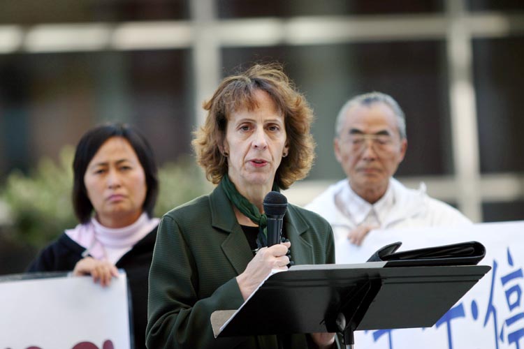 ![]() “正义与追查责任中心”执行主任科利瓦律师(Sandra Colliver)在旧金山联邦法院前举行的新闻发布会上发言 |