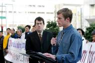 ![]() 法轮功学员麦特在新闻发布会中宣读松贺默的致函 |