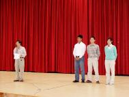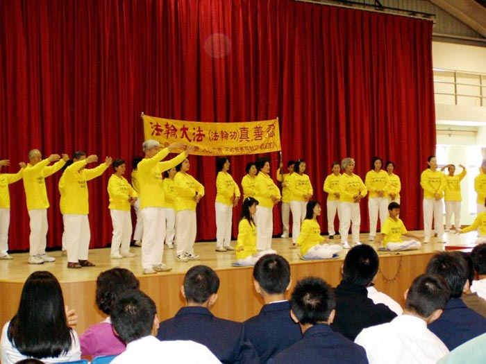 中场由台东法轮功学员进行12分钟的功法表演,五套功法同时呈现,动作整齐而优美;台下的师生有许多人跟着学起了动作。在功法表演的队伍中,一位小男生吸引了大家的目光,他是从台东县池上乡特别请假来参加的小六学生,学法轮功迄今才三个月。他的母亲接受健豪访问时说,儿子刚学法轮功一个星期后,原本鼻子过敏常流鼻涕的症状就有了明显改善,现在即使是冬天还穿短袖,和以前怕冷又爱感冒简直判若两人,校长及老师因此都知道法轮功强身健体的神奇效果。