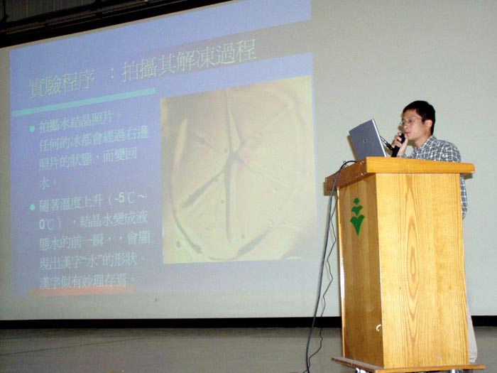 健豪接着讲了一个小故事——生命中的万能钥匙,他因为找到了这把能够开启心灵之门的万能钥匙,不但化解了与同学之间的矛盾,也让自己的学习及生活越来越轻松自在,这把万能钥匙就是“真、善、忍”。健豪还特别用日本江本胜博士所做的水结晶实验为例子,说明每个生命都需要真善忍。当大萤幕上显示水听到骂人粗话而呈现支离破碎的丑陋型态,以及听了赞美的话展现出晶莹美丽的结晶体时,几乎所有师生都睁大了眼睛并发出惊叹声!
