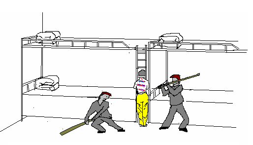 【明慧网2004年12月26日】(刚从吉林省朝阳沟劳教所释放的大法弟子口述)朝阳沟劳教所对不转化的大法弟子搞攻坚战时使用一种卑鄙手段:强行将大法弟子的头塞进上下铺梯子里面,双手抱梯子绑上,然后,几个恶徒拿镐把从脖子排打到脚后跟,直打到恶徒们累了才停下来。不转化第二天再照此法排打若干遍。后背血肉模糊,皮开肉绽,肿得变了形,衣服碰一下都痛得钻心,如果不修大法,没人能挺过第二次排打。