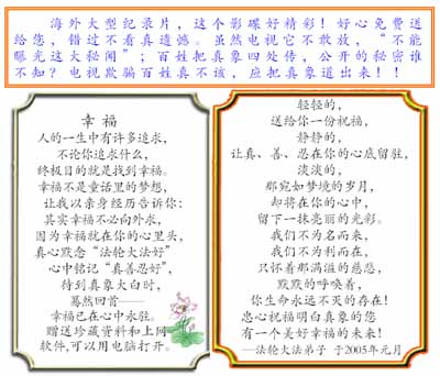 【明慧网2004年12月29日】风雨天地行“封面寄语”纸袋打印排版是直接打印在市场上常见的VCD光盘袋的背面,此种光盘袋是纸制的、正面是透明塑料。打印时最好在打印机的属性里设置成旋转180度,把纸袋的下端先放入打印机,这样更容易打印。