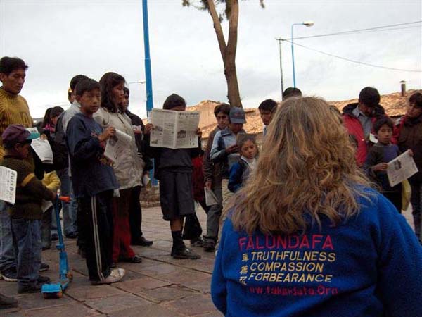 由于想了解真象的人实在太多,学员们无法照顾到每个人;所以对那些希望了解更多情况的人就另约了时间,其中包括一位秘鲁体育研究所(IPD)的心理教师。他邀请学员到他的研究所向老师和学生们介绍、教炼法轮功。