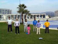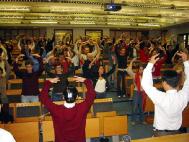 | 法轮功学员们应邀来到西班牙卡斯泰昂JM大学 | 全体与会者起立与法轮功学员一起做法轮功第二套功法“法轮桩法” | |