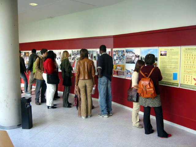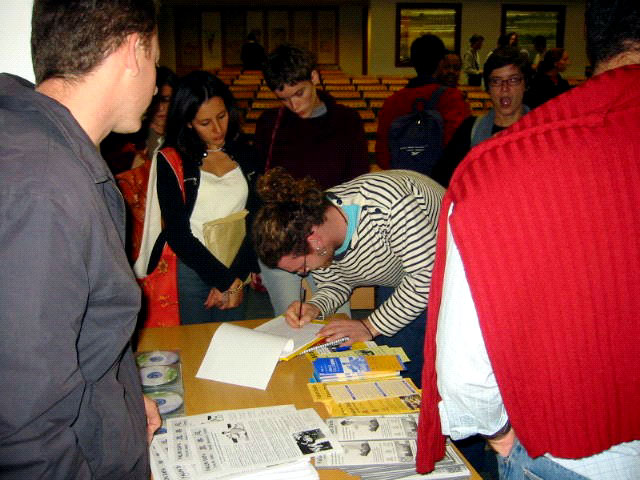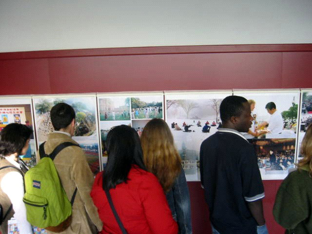 | 与会者们排队在停止迫害呼吁书上签字 | 法轮功学员先后在这所大学的两个学院里举办了正法之路图片展 | |