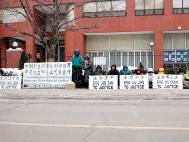 2月14日,温哥华学员在中领馆前举行持续7个小时的抗议活 动,揭露江氏集团新一轮的迫害升级,悼念最近迫害致死的二十多位国内同修,强烈要求惩办迫害法轮功的元凶――江泽民、罗干、刘京和周永康。