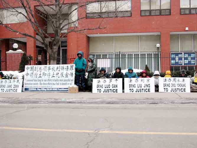 参加请愿活动的法轮功学员表示:我们在领馆前举行烛光静坐请愿,是为了声援我们在国内的同修,强烈要求中国政府停止迫害。法轮功学员还介绍说,举办和参加抗议活动的目的是为了揭露迫害的真相和讲清法轮功的真相。抗议中,法轮功学员针对的都是迫害法轮功的凶手,而不针对任何国家和政府。在这场迫害中,罗干(中央政治局常委、中央政法委书记)、刘京(中国公安部副部长、中央610办公室副主任)及周永康(中国公安部部长)是直接参与追随江泽民迫害法轮功的罪魁祸首。所以今天打出的横幅中表达了法轮功学员法办策划迫害的元凶江泽民、及其追随者罗干、刘京及周永康的要求。