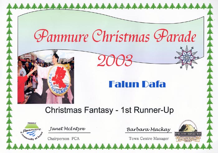 每年潘牧(Panmure)地区的游行都吸引当地上千人观看。社区服务部门、华人社团、学校和商业实体等几十个团体参加了本次圣诞游行。参加游行的法轮功学员们的着装和花车一年比一年漂亮,赢得了无数观众的掌声。路旁友好的人群喊着“你好”。