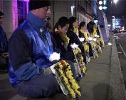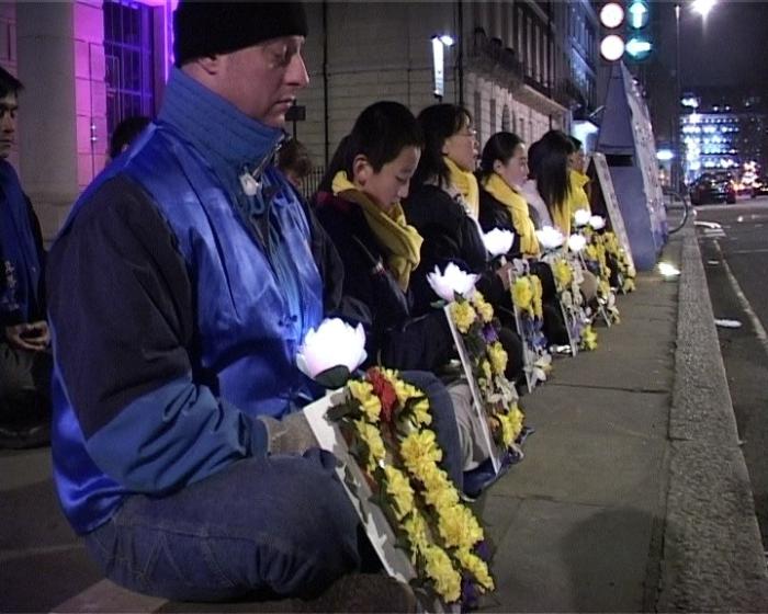 在晚间的烛光守夜活动中,学员们手持莲花烛灯静静的坐在领馆对面,在宁静祥和的普度乐曲伴随下,追悼死难的同修,呼唤世人的正义良知。