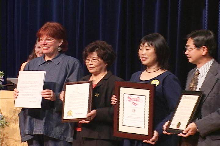 庆典仪式于下午两点四十五分开始。首先,法轮功学员代表致开幕词。她扼要介绍了法轮大法在世界各地的洪传概况、法轮大法学员对圣地亚哥县人民和社区的贡献及所受到的热烈欢迎和奖励,以及大法弟子在中国大陆所受的邪恶迫害。