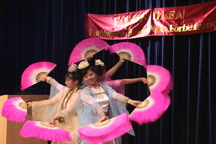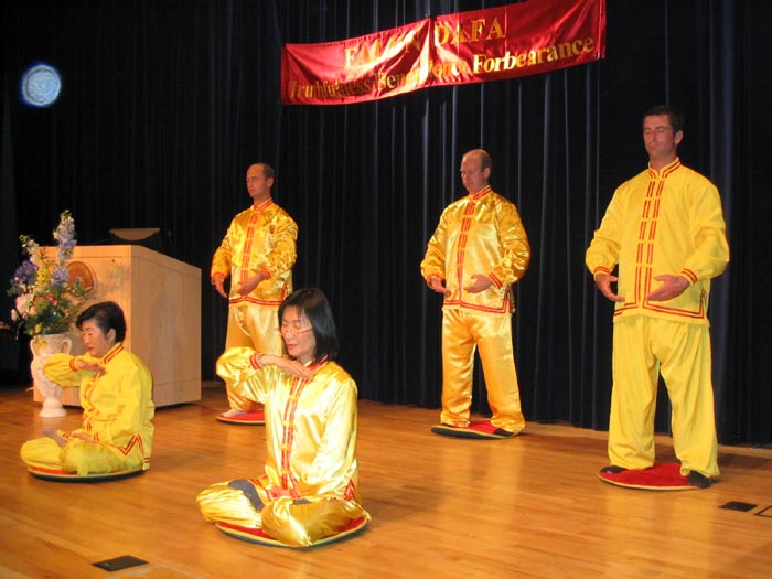 五位中西方法轮功学员表演了五套法轮功功法,学员们优美舒展的动作吸引了在场的所有来宾和观众。接下来,一位大法小学员还表演了古筝独奏,一位男学员表演了武术,四位女学员表演了舞蹈。大法弟子的精彩表演赢得了在场观众的热烈掌声。