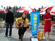 有游客倚在旁边、斜对面的栏杆静静听着;有游客聆听良久,轻轻跟着哼了起来。有游客一面凝望着学员诚挚的脸庞、学员手上的「法轮大法好」、「真善忍」展板,一面对照着手上的真象材料仔细看了起来。