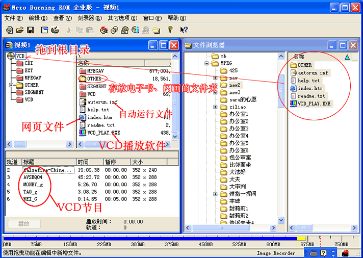 7、把网页文件拖放到A区的根目录下,包括自动运行文件和播放VCD的软件——VCD player。如图所示: