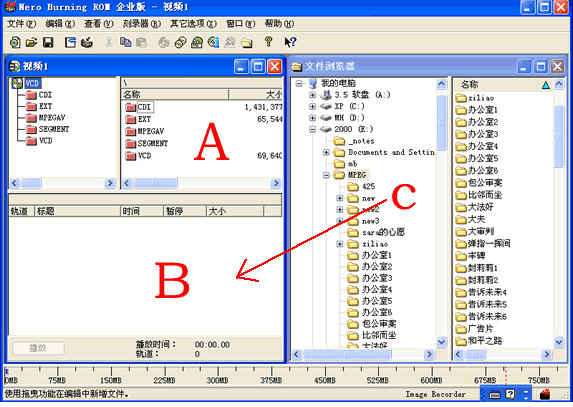 为讲解方便,我们划分A、B、C三个区域。C区相当于电脑的资源管理器,可以浏览电脑文件。B区为节目区。把C区的mpeg或DAT格式文件拖到这里,并可以用鼠标调整顺序。A区是光盘文件目录区。