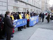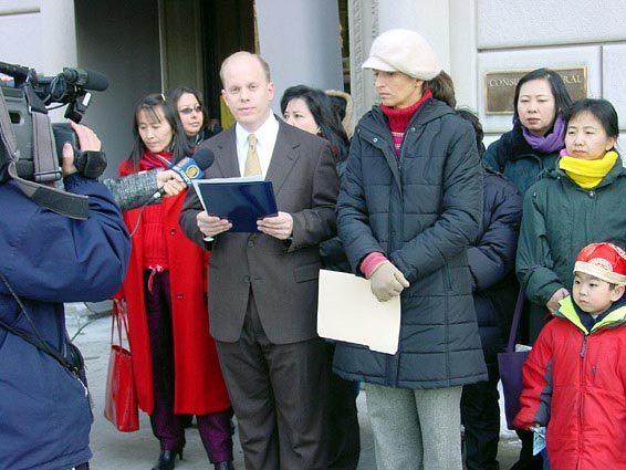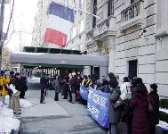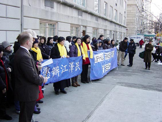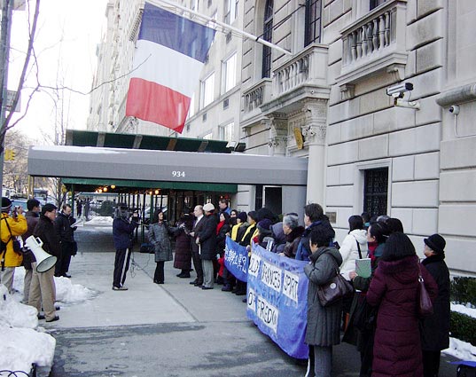 数十名纽约法轮功学员赶来参加了新闻发布会。学员们手持“维护法国自由精神”、“惩办江泽民”等中英文横幅,静静地聚集在法国驻纽约领馆门前。新闻发布会主持人诺亚-派克首先宣读了美东法轮大法佛学会代表所有大纽约地区学员写给法国驻纽约总领事的公开信。