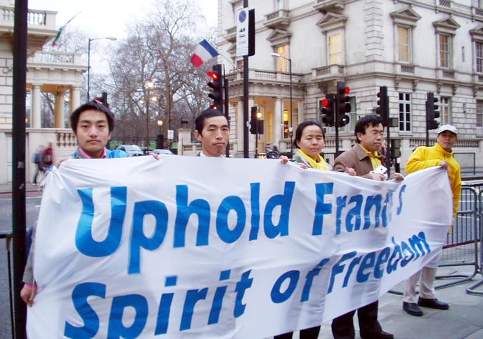 今年是中法建交40周年,为此,官方通过推出巴黎“中国文化年”活动等,配合中国国家主席胡锦涛访问法国,营造友好气氛。但是,就在这个“文化年”的“友好”活动中却发生着野蛮的“非文化”“不友好”行为。据2004年1月31日明慧网报道,一些法轮大法学员,1月24日准备参观在巴黎香榭里舍大街举行的中国农历新年大游行时被巴黎警方无故抓捕、讯问和粗暴对待。据报道,他们在被抓时,没有做任何违反法国法律的事情,他们被抓的唯一原因是因为他们佩戴的有法轮大法字样的黄色围巾。作为一个中国的法轮大法修炼者我知道,这种现象在中国并不罕见,4年多来太多的法轮大法学员被抓捕、被抄家,被残酷地折磨,被强迫洗脑,甚至被夺去生命。但当我听到这样的事情在法国也有发生时,我依然感到非常的不解和痛心,因为据说法国是一个以“自由、民主、博爱”为立国之本的国家。