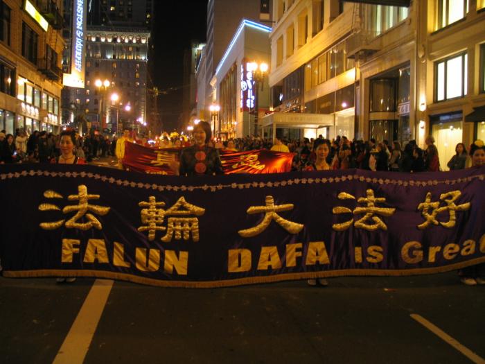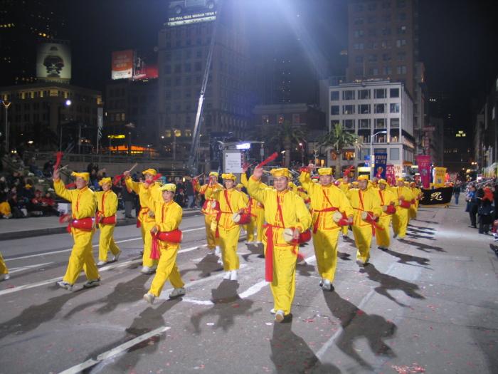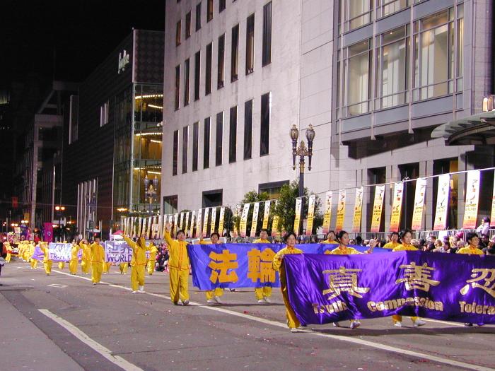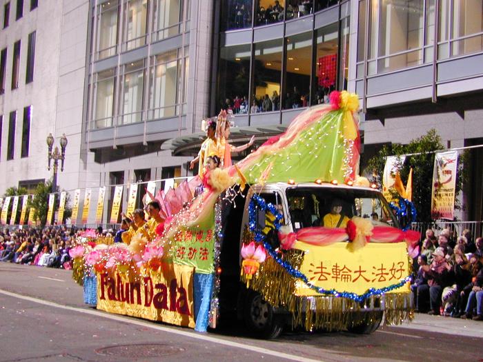 法轮功第一次参加旧金山庆新年大游行,倍受瞩目。学员们在游行出发地点排练时就有大批的媒体围观,不停地拍照。一路上,法轮功的队伍获得了热烈的欢迎。队伍中有七仙女舞、彩灯舞、扇子舞、腰鼓队和花车。祥和的音乐,绚丽多彩的服装和优美的舞姿,不断获得市民们的掌声。观众通过花车上的功法表演和“法轮大法好”、“真善忍”、“世界需要真善忍”等横幅看到了法轮功的风范。