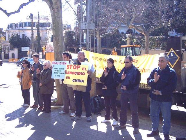 【明慧网2004年3月1日】最近几月,又有数十名法轮功学员在中国被残酷致死。为此,2004年2月22日,西班牙巴塞罗那大法学员们来到了位于巴塞罗那的中国领事馆前,和平抗议中国江氏集团对无辜善良的法轮功学员们的疯狂非法的迫害,同时要求立即停止迫害并法办犯下了滔天罪行的首恶江泽民及其主要帮凶罗干、刘京、周永康。