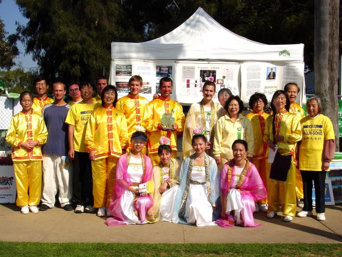 除了参加游行外,学员还在游行后的集会处订了一个展位,一边表演功法,一边向人们介绍大法和讲清真象。另外,十名学员还在市政府所设的临时舞台上向观众表演了法轮功功法。