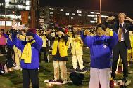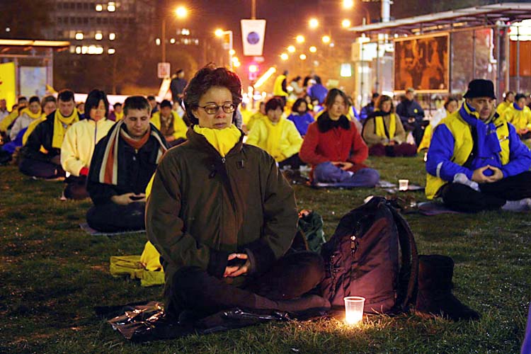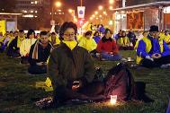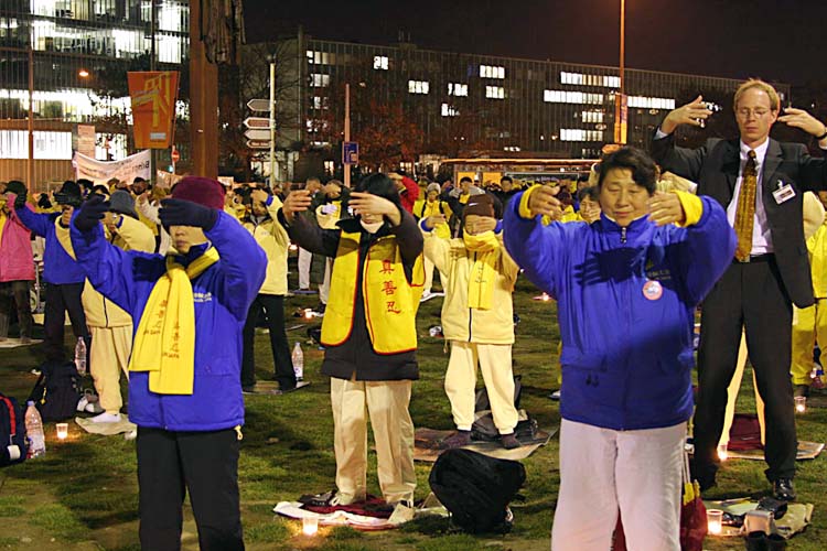 由于在联合国人权委员会讨论的议题很多,到晚上近8点时,各国代表仍然在开会。法轮功学员们一整天在外面的广场上炼功发正念,场面祥和,到了晚上仍然不知疲倦地守着烛光向各国代表呼吁,看着由一盏盏烛光形成的灯海,很多开会的代表深受触动。后来有非政府人权组织的代表到广场上向学员们致意。