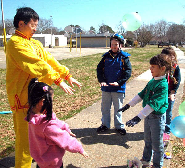 诺福克是一座海滨城市,当由仙女队和炼功队组成的法轮功方阵一出现,就引起了当地居民的强烈关注,大家都在谈论着,小孩子们可等不住,直接上来问是什么,简单的介绍之后,就非常喜欢。尤其是特别喜欢学员们送给他们的纸莲花,还把花别到头顶上,然后她们还跟着炼功,炼得非常认真。