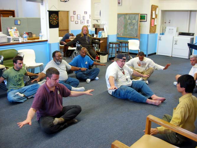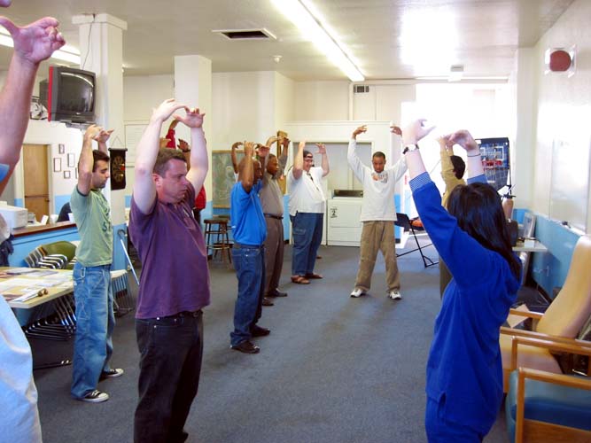 无家可归者很认真也很感激得到这些信息,他们真的想学法、学功。一些人直上直下移动胳膊有困难,胳膊有时会抖动,但他们仍然尽力坚持而不放弃。有些人在打坐时无法坐在地上盘腿,他们只能把腿伸直。还有一个人坐在轮椅上,另有一些人无法坐在地上打坐。但所有人都尽力去做,没人抱怨。当我们教完功后,放了一会儿第五套功法的音乐以使他们可以体验打坐的感觉。没人说话或停下来,他们都努力地坚持到底。