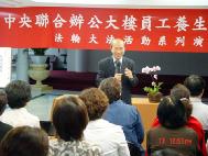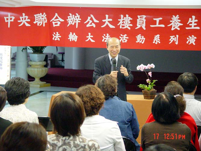 | 法轮功学员在会场外摆放大法简介及真象图片 | 员工们在演讲开始前浏览法轮大法真象图片 | 敖医师向大家介绍健康之道 |