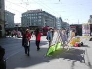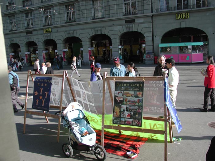 洪法摊位就设在市中心,火车站旁边是各种车辆的总站,也是伯尔尼的交通要道。络绎不绝的人群穿梭不停。首先映入人们眼帘的是醒目的“法轮大法好”五个大字。大法弟子发正念、炼功,祥和的炼功音乐,师父慈悲的声音,引来很多有缘人,驻足观看我们演示的五套功法,有的还跟着认真的学炼。有的问我们哪里有炼功点,并主动索取真相材料。
