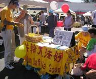 本次节日,法轮大法所设的展位正置于两个主舞台间,来观看询问的人络绎不绝。学员们在展位前的功法练习吸引了不少驻足观看的过路人,有的询问炼功的地点和时间,有的当时就学起了功法动作,有的则打听在哪里能购到大法书籍。