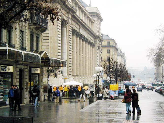 在当晚正式演出之前,他们自告奋勇走上街头,为日内瓦市民、各国游客表演,传达无数法轮功学员的心声。尽管日内瓦街头春雨纷纷,却丝毫挡不住他们的兴致,只要看到他们那认真、专注的表情,听到他们那忘我的歌声,就会感觉到他们是在用心在表演的。