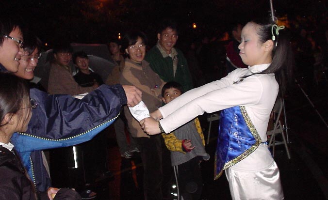 还有的同学赞叹表演者歌声清纯,有的拿了赠送的CD,说要回去好好聆听;有的在问炼功点……。