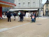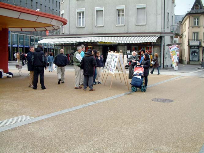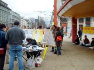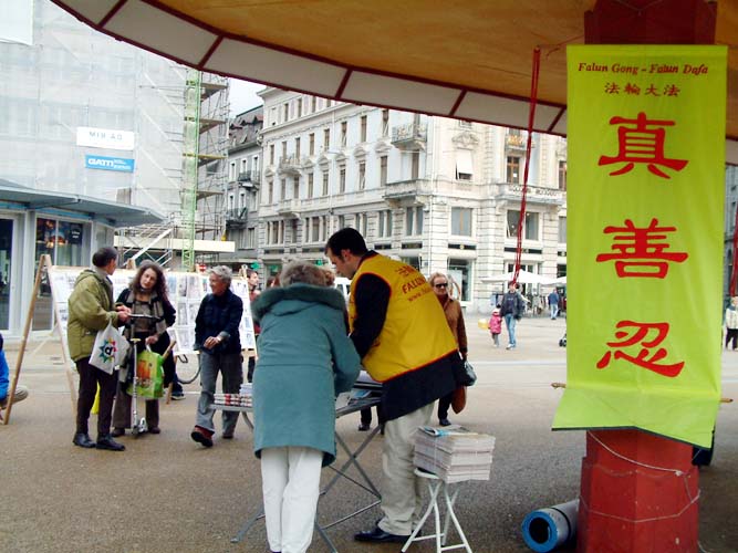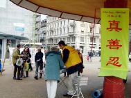 大法弟子们与人们交谈,向大家介绍法轮功以及在中国发生的对法轮功学员的残酷迫害。一位来自中国的年青人,听了大法弟子讲述法轮功被迫害的真象后,说,江××这个人是很残暴的。