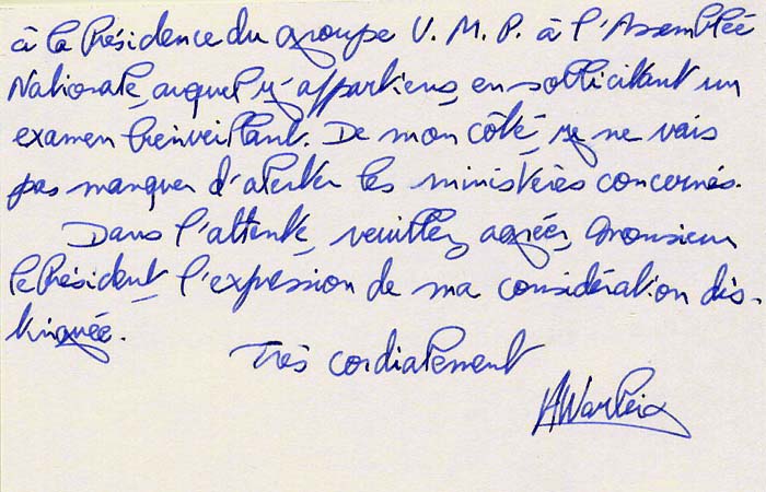 我立即就把您的来函转给了我所在的“人民运动联盟党”(U.M.P)在国会的主席团,建议能对此进行善意的调查。我自己也会向有关的部门就这一事件示警。
