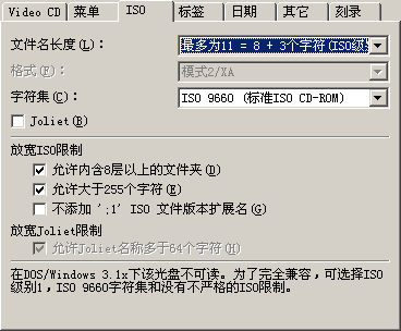 选择“文件名长度(L):最多为11 = 8 + 3个字符(ISO级别1)”