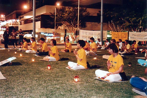 随着大法音乐,几名学员向游人过客演示了祥和的法轮功法,行人莫不驻足观看,其中还有不少从中国大陆来的游客。