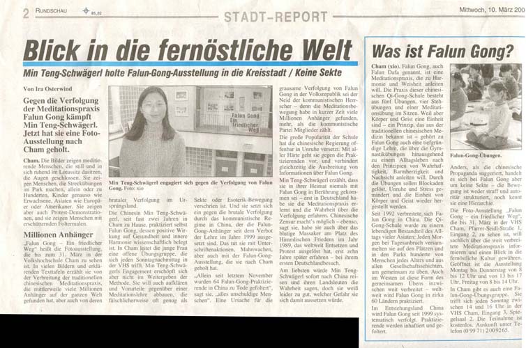 德国环视周报3月10日报道,德国法轮功学员滕敏-史瓦戈(Min Teng-Schwagerl)抗议对打坐功法法轮功的迫害。现在她将法轮功图片展带到了卡姆市。这些图片展示一群打坐的人们。他们平静安详的盘腿打坐,闭着双眼。图片展示给人们有单独、成群的人,有孩子,也有成人,有亚洲人也有欧洲人和美国人,他们在公园里炼伸展的功法。图片也展示了抗议之声和令人发怵的酷刑。