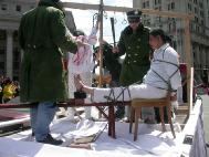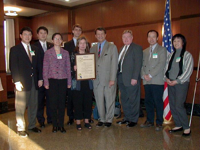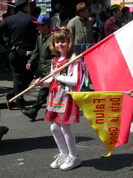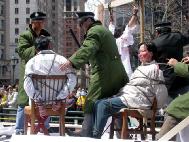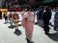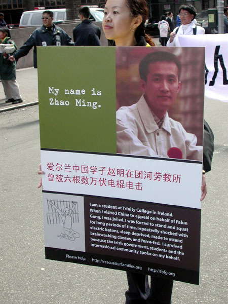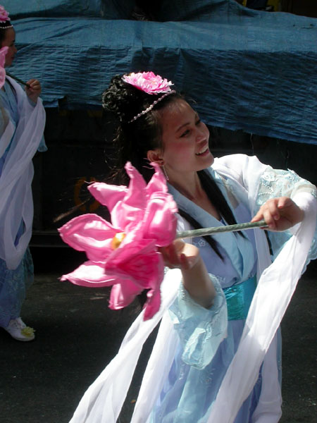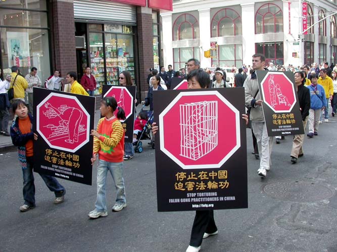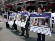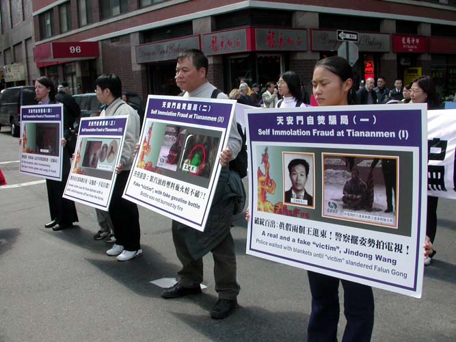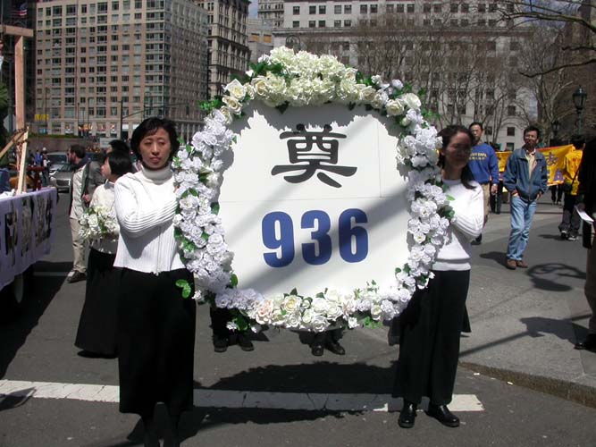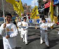 世界日报4月11日报导,昨日中午时分,大批法轮功学员陆续前往下城法利广场聚集,准备游行。参与游行者以华人为主,外籍人士也不少,有的一家大小,有的男女结伴。游行开始前,学员都在广场内静坐炼功。游行队伍当中除了有敲锣打鼓的鼓队之外,也有布置特别的花车、仙女等人物。同时也有人化妆成遭殴打、虐待等都在街上游行。昨日天气暖和,华埠游客特别多。