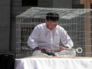 我也想打横幅,可没等打开就给警察抓住拖到了车上,带到了广场前一个派出所,关到好象是一个后院里,不一会就有四十多名大法弟子关在那里。大家在一起背《论语》背《洪吟》。大法弟子把随身带的横幅一个接一个打开,不干胶真象贴在身边的墙上,警察打大法弟子时大家一起保护同修,喊“不许打人,打人犯法”。晚上警察用大客车把我们送到北京南边一个看守所。在那里警察不给饭吃,没有被褥冻了一宿,第二天早上被转到了怀柔看守所。