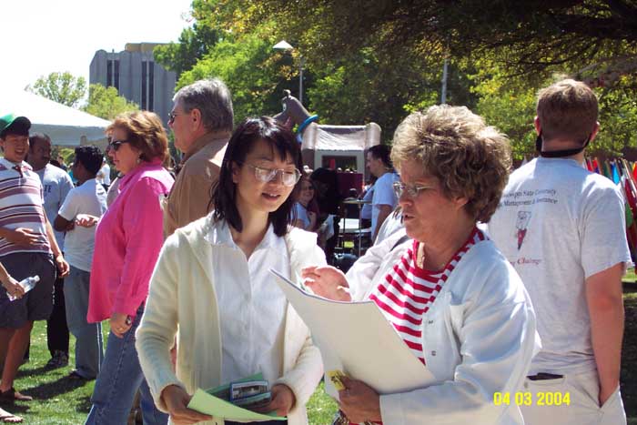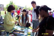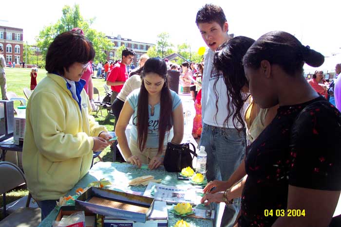 为了这次活动,当地的法轮大法学员在他们热心的朋友们帮助下,准备了三百多个彩纸莲花及毛笔书写的“真善忍”字条。当天,几乎每个来到法轮功学员展位的人都很欣喜的接过纸莲花及法轮功介绍资料。其间也有人来询问法轮功在中国无辜受到迫害的情形。同时,许多人要求学员教他们叠莲花。