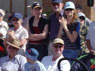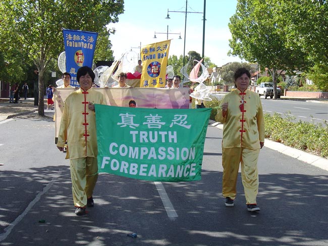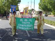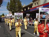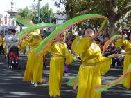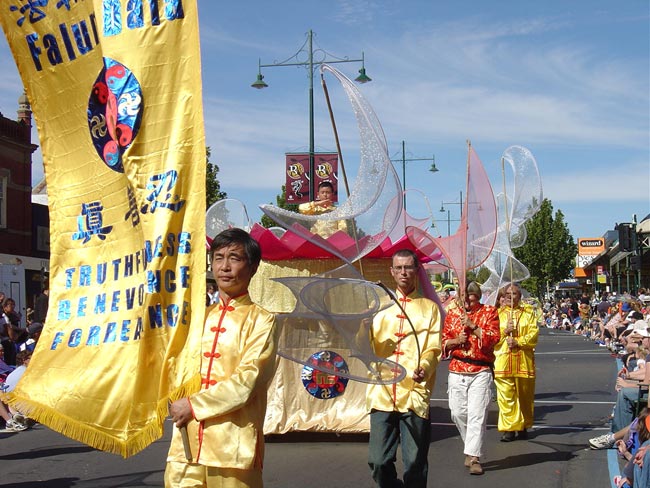 中午12点,沿着该镇主要街区缓缓前进的游行队伍拉开了班迪戈节的序幕。在众多的游行队伍中,由孩童组、旗帜组、莲花彩云组、功法表演组、扇舞组、唐装组、彩带舞组和大法洪传标牌组8部分构成的法轮大法游行队伍格外引人注目,所到之处受到了观众的热烈欢迎。在观众赞许的掌声中,法轮功学员不时能听到他们由衷的叫好声。