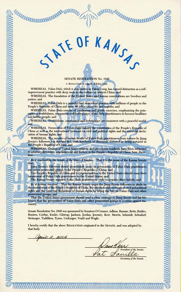 堪萨斯州参议院敦促江泽民及其追随者们解除对法轮大法和其它受迫害群体的禁令,以行动遵守中华人民共和国宪法,《民事和政治权利国际公约》以及《世界人权宣言》;