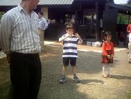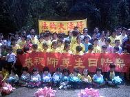 此次参与的法轮功学员约有一百人。游客来来往往,不由得好奇的观看学员的集体学法及炼功活动。此时,学员热心地递上真相资料或书签、光碟等,人们都很高兴的接受。甚至小弟子们在草坪炼功时,一些游客在旁边也自行学着比画起来,饶有趣味。其中有一个小弟弟,自己学着小弟子们打坐、结印,姿势标准。问他想不想学法轮功?他回答说: “想啊,可是我不知道要怎么学啊!”